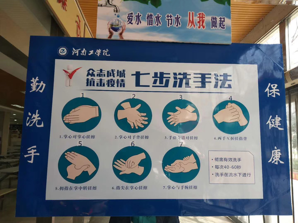 39.在就餐場所配備足夠的可以正常使用的洗手消毒設(shè)施,洗手設(shè)施上方張貼規(guī)范洗手步驟示意圖,全面普及“內(nèi)-外-夾-弓-大-立-腕”的七步洗手法,引導(dǎo)師生餐前洗手并成為習(xí)慣。